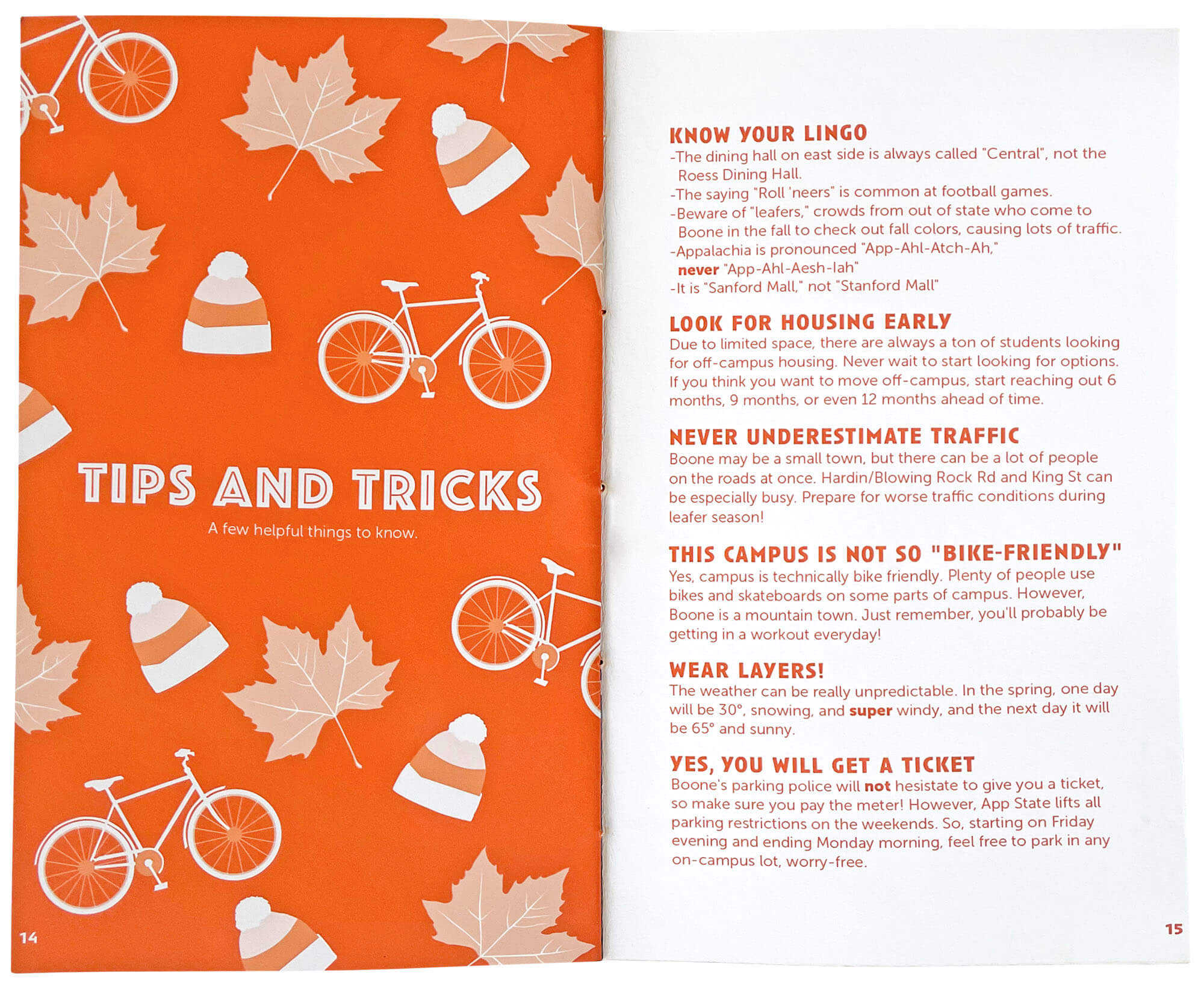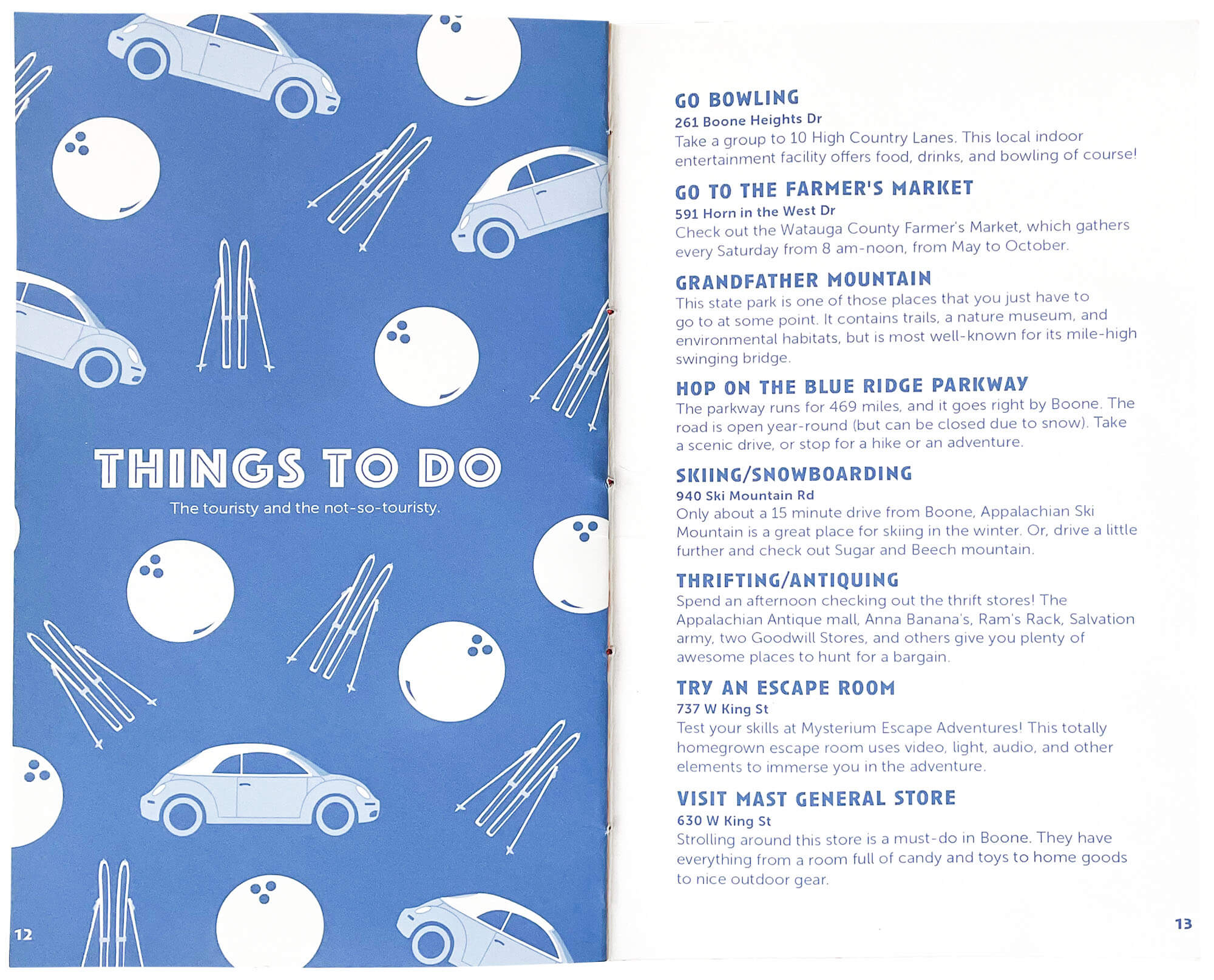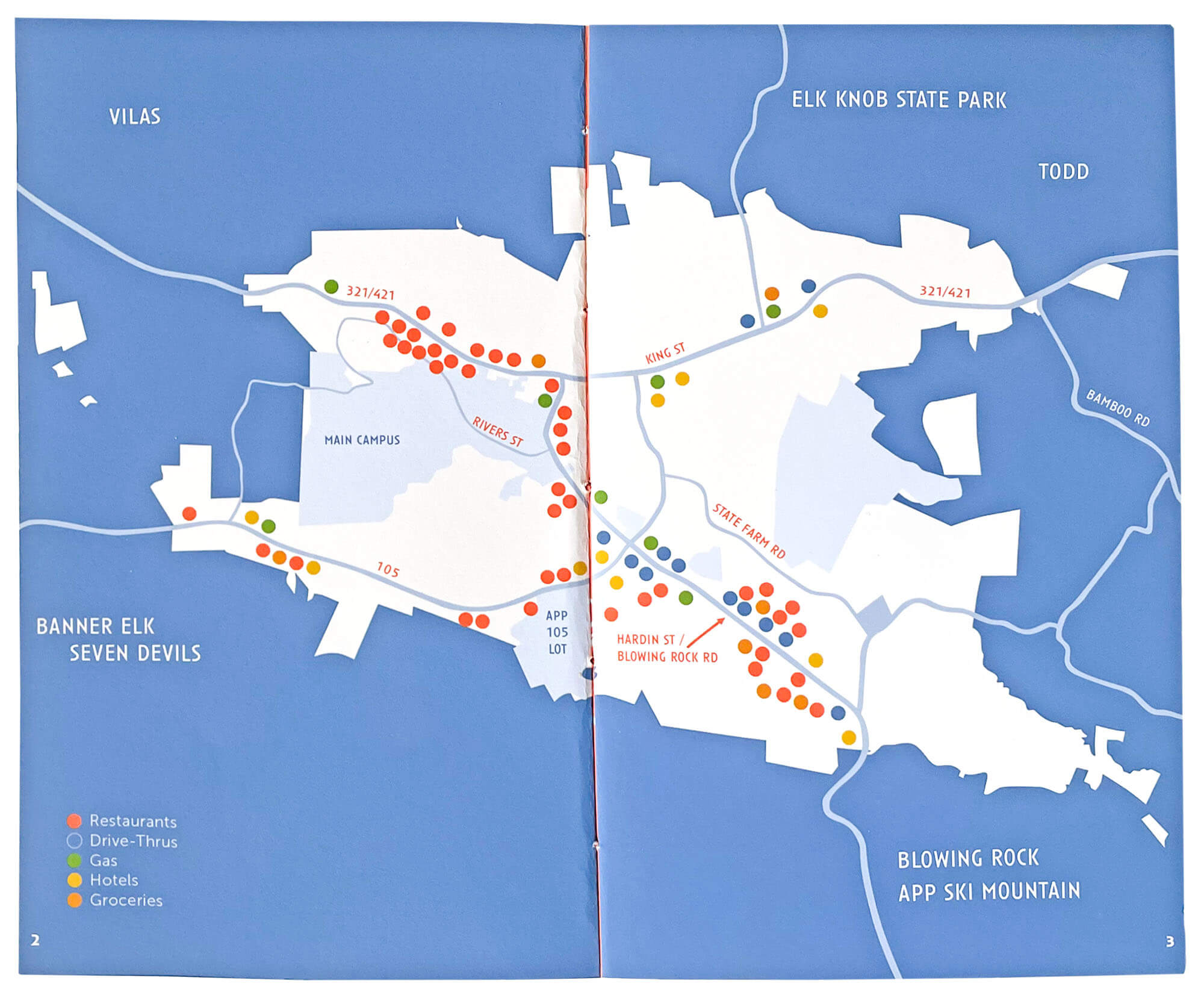 The Incoming Student’s Pocket Guide to Boone is a compilation of designed maps, lists, and other insider information.