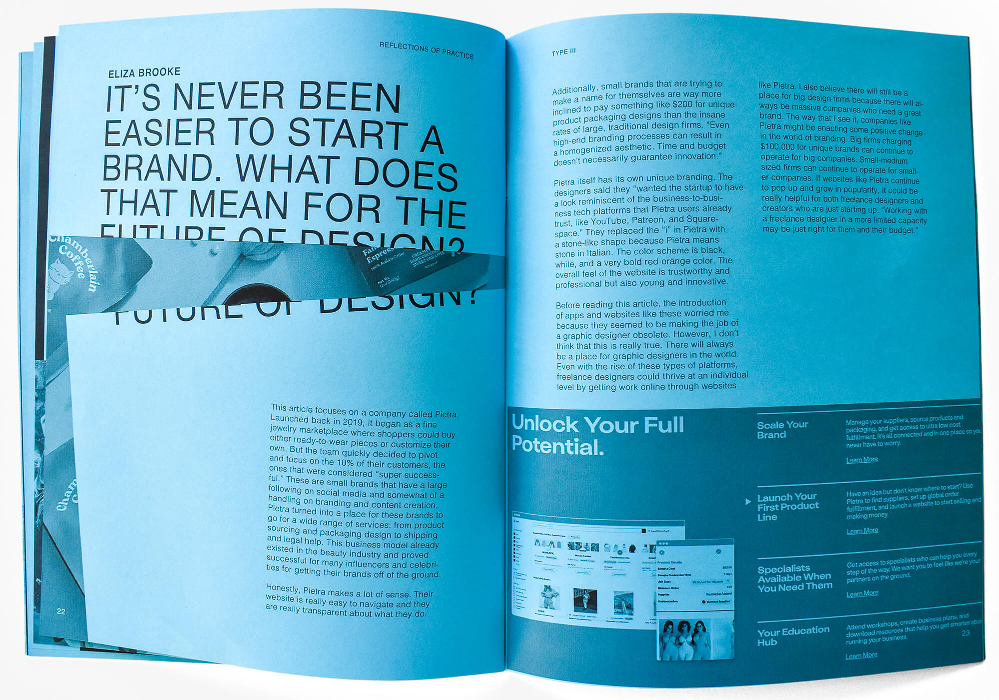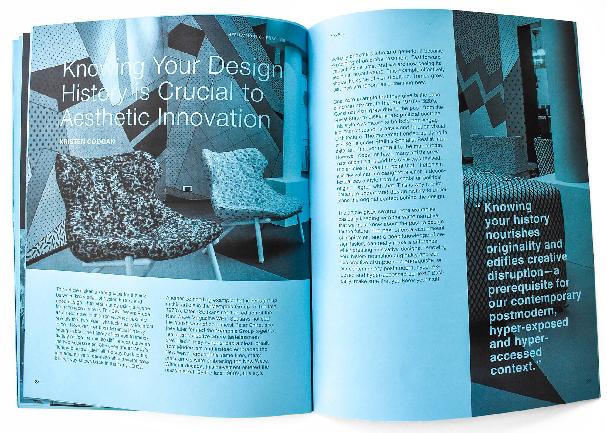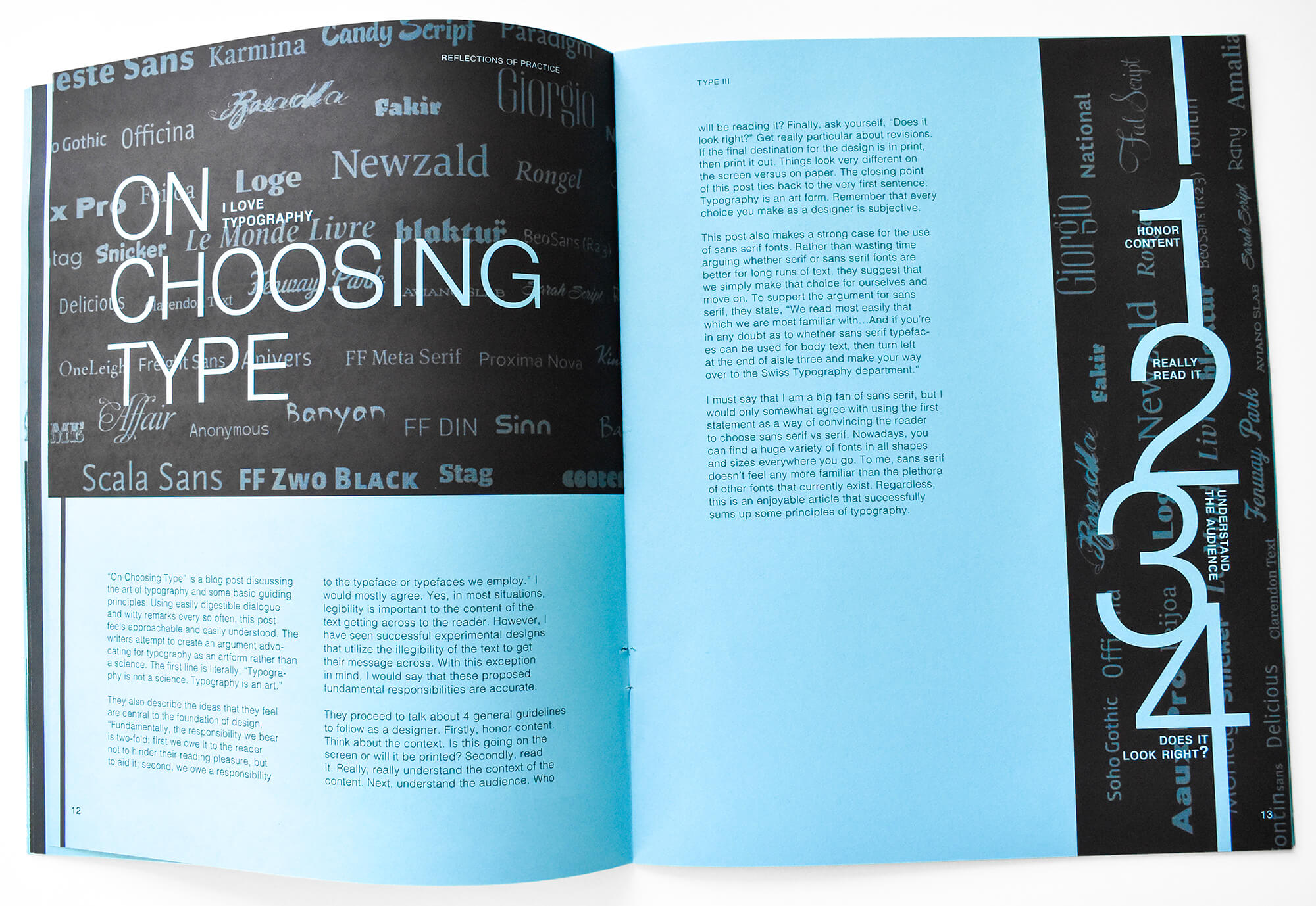 This publication is a study in systems, typography and layout. Over several months, the writings and spreads were simultaneously created. Then, the spreads were refined into a consistent design system.
