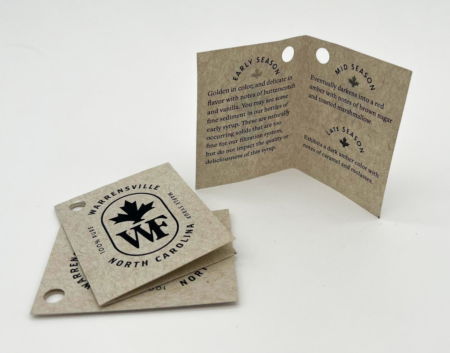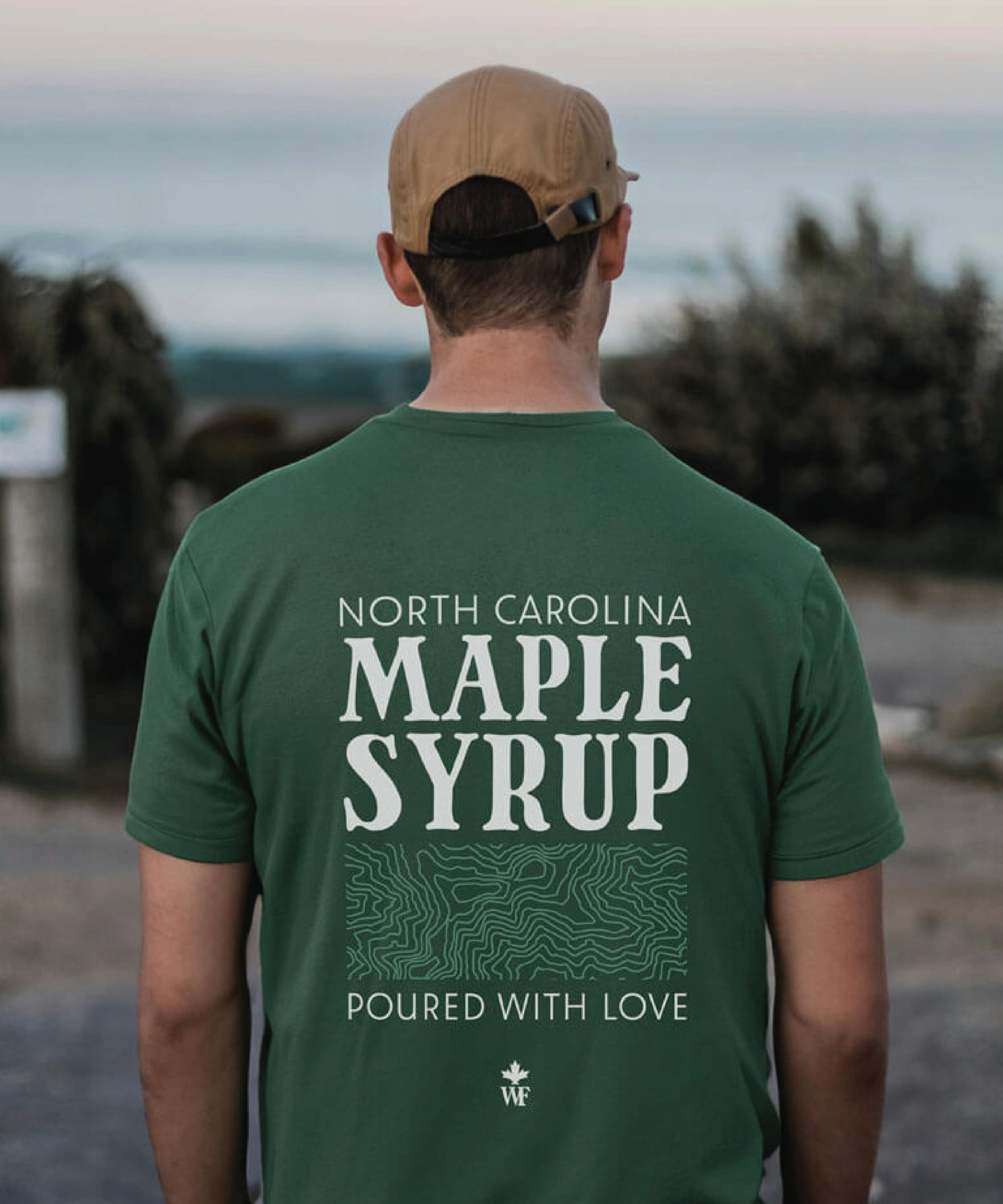 The white lines on the maple syrup bottle imitate a topographic map of Three Top Mountain, the mountain on which the farm was built.