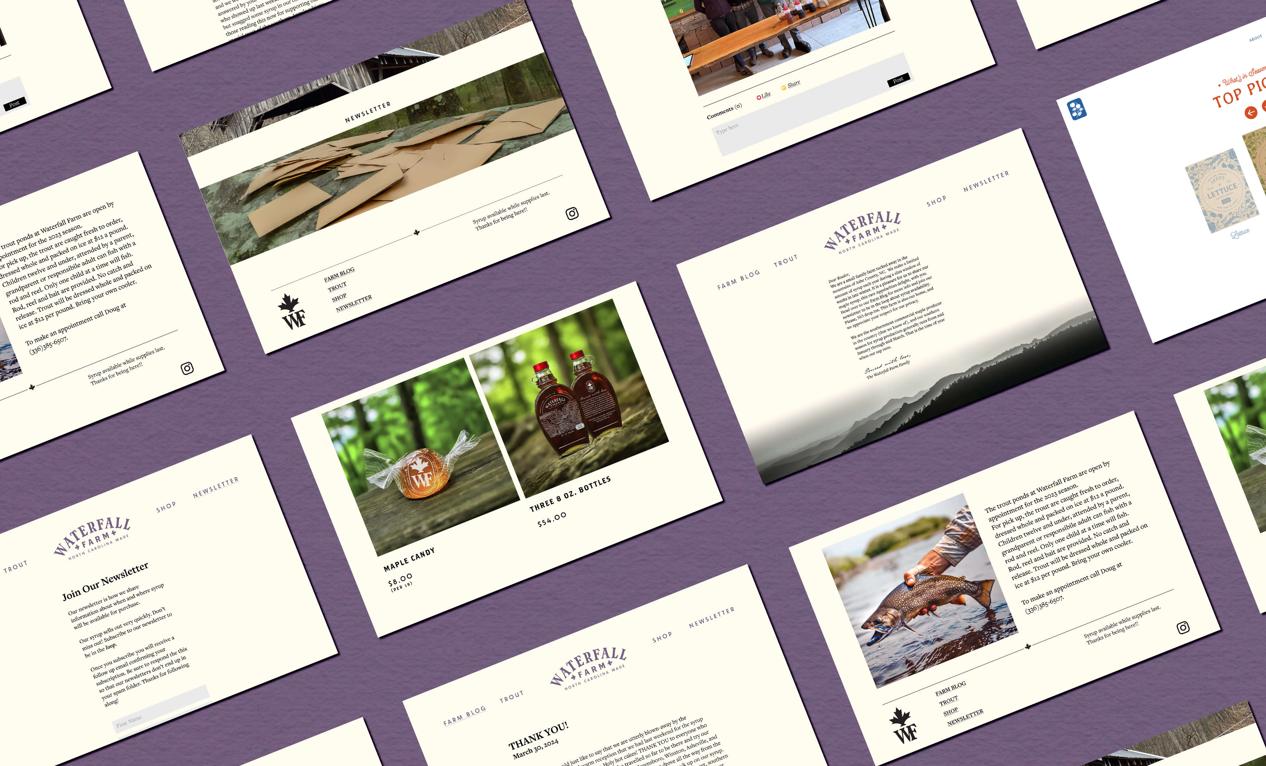 Assets created for Waterfall Farm include maple syrup bottle designs, informative hangtags, maple syrup candy packaging, t-shirt designs, and a website prototype.
